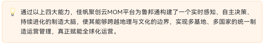 作為此次合作的核心伙伴之一,魯邦通(廣州魯邦通物聯網科技股份有限公司)實力雄厚:國家級制造業單項冠軍企業 國家級專精特新“小巨人” 成立16年來,魯邦通始終專注于物聯網通信網關、邊緣計算終端等智能設備的研發與制造,產品遠銷100多個國家和地區,設立11個海外辦事處,服務全球超10,000家行業客戶,全球聯網設備累計超200萬臺。堅持技術驅動的魯邦通,研發投入占營收比重持續超過10%,在智慧園區、智能裝備、遠程運維等領域占據領先地位。 本次合作以佳帆科技自主研發的聚創云MOM制造運營平臺為核心,基于云原生、微服務架構,為魯邦通構建覆蓋全球多基地、多品種、高復雜度的數字化制造運營體系。其核心價值不再局限于單點效率提升,而是從四大戰略維度重塑企業競爭力,構建企業級“制造大腦”,全面賦能全球化運營: 制造大腦的核心神經網絡:打破傳統MES僅關注車間執行的局限,佳帆聚創云MOM平臺貫通產品BOM、工藝路線、生產指令、質量數據、設備狀態、物料流轉等全要素信息,構建端到端數字主線。 調度決策中樞:針對多品種小批量、頻繁插單改單的典型挑戰,佳帆聚創云MOM平臺采用智能排程引擎與實時資源沖突檢測,將訂單承諾、物料齊套、設備能力、人員資質等多約束條件納入統一優化模型。 工藝規則庫:佳帆聚創云MOM平臺內置工藝參數建模與自適應控制能力,將老師傅的經驗轉化為可配置、可遷移的工藝規則庫。通過實時采集設備運行數據與質量檢測結果,系統能夠識別關鍵工藝參數與產品質量之間的隱式關聯,主動推薦最優參數組合。 面向魯邦通產品出口100多個國家和地區的業務格局,佳帆聚創云MOM平臺提供多語言、多時區、多法規框架的追溯能力。 本項目是魯邦通作為國家級制造業單項冠軍與專精特新“小巨人”推進智能制造戰略的關鍵里程碑,也是佳帆科技作為廣州市中小企業數字化轉型城市試點數字化牽引單位在高端離散制造領域的深度賦能典范。 通過佳帆聚創云MOM平臺的全面實施,魯邦通將達成三大戰略目標: 流程重塑:打破部門信息孤島,建立以數字主線為核心、數據驅動的高效制造流程; 績效可視:基于實時采集的產量、質量、工時等數據,構建班組與設備級績效評價體系,支撐持續改善; 生態互聯:整合生產、質量、倉儲、設備等多維數據,為經營分析與供應鏈協同提供透明、可信的數字底座。 佳帆科技與魯邦通的深度合作,標志著中國離散制造運營管理已從“工具賦能”邁入“大腦構建”的新階段,更是中國離散制造邁向“認知智造”新時代的標志性實踐。 面向未來,佳帆科技將持續賦能魯邦通,共同打造“響應快、品質穩、成本優”的全球領先智能工廠,為離散制造行業提供可復制、可推廣、可進化的數字化轉型范式。 同時,以“小巨人”的創新銳度,賦能“單項冠軍”的全球征程,在制造強國與全球競爭的宏大敘事中,書寫屬于中國智造的時代答卷。當前,離散制造行業正經歷從“大批量標準生產”向“多品種、小批量、高頻換線”的深刻轉變。訂單碎片化、物料種類激增、工藝變更頻繁、質量追溯復雜等問題,讓傳統ERP+人工調度模式難以為繼。構建透明、協同、智能的制造運營體系,已成為傳統制造業保持領先競爭力的必由之路。